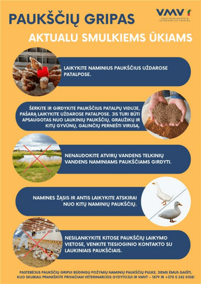 Paukščių gripo virusas šiemet balandžio mėnesį buvo aptiktas ir gamtoje – jis patvirtintas gulbėms Kaune, Neries pakrantėje. Rizika virusui paplisti ir patekti į paukščių laikymo vietas išlieka aktuali visoje Lietuvos teritorijoje.